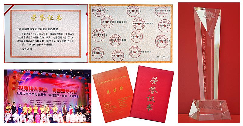 近日,由我校精神文明办公室组织承办的上海市大学生文化志愿者“走进崇明-港区”文化交流展演活动喜获2012年度上海市文化科技卫生“三下乡”活动优秀项目奖。该活动由市委宣传部、市文明办、市教委主办,旨在鼓励在繁荣农村文化、普及科学技术、服务农民群众、促进农村经济社会发展。