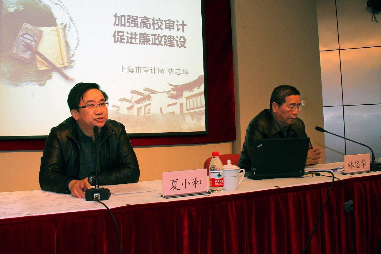 12月10日,上海市审计局总审计师林忠华在校本部行政楼报告厅为校、院两级中心组成员作了题为“加强高校审计,促进廉政建设”的报告。校党委副书记、纪委书记夏小和,副校长丛玉豪等领导及校院两级中心组成员,副处级以上干部近两百人聆听了报告。报告会由校党委副书记、纪委书记夏小和主持。