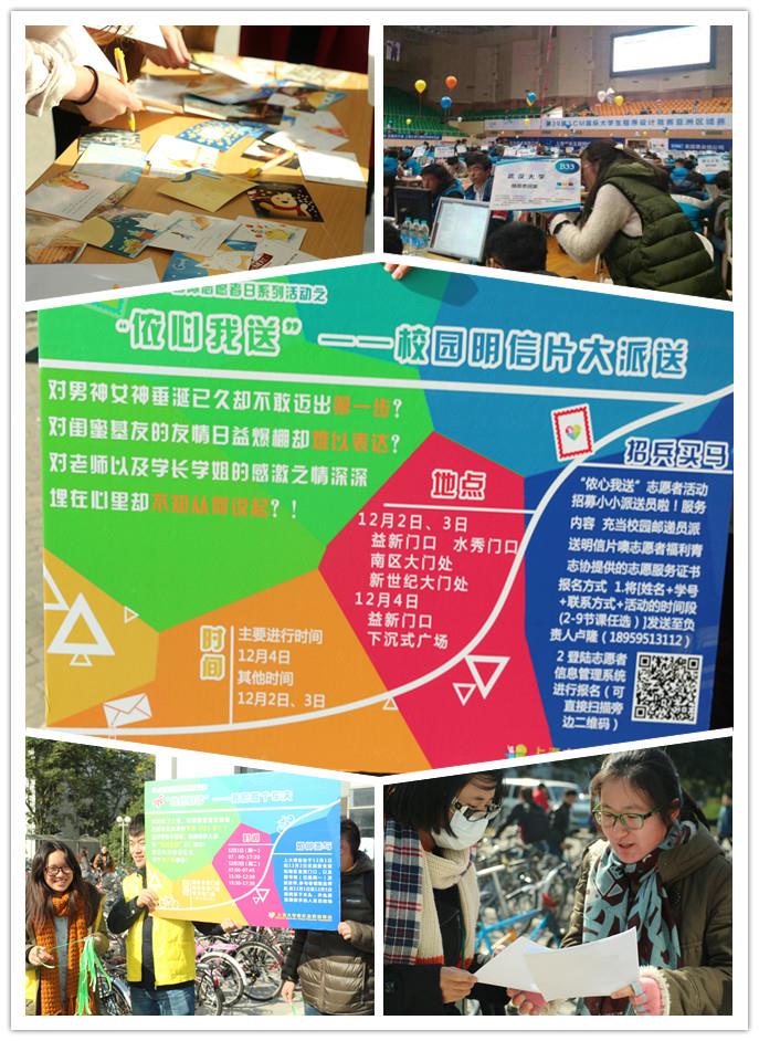 2014年12月5日,我校迎来了第29个国际志愿者日,12月1日到12月7日,在校院两级青年志愿者的牵头组织下,开展了一系列丰富多彩的志愿宣传与服务活动。“志愿心,志愿行”,“志愿心”意在心怀志愿,“志愿行”意在将志愿付诸于行动。通过12.5国际志愿者日主题活动,希望在学校里进一步宣扬志愿服务精神,打造上大志愿文化品牌,培育和营造“奉献、友爱、互助、进步”的校园志愿氛围。