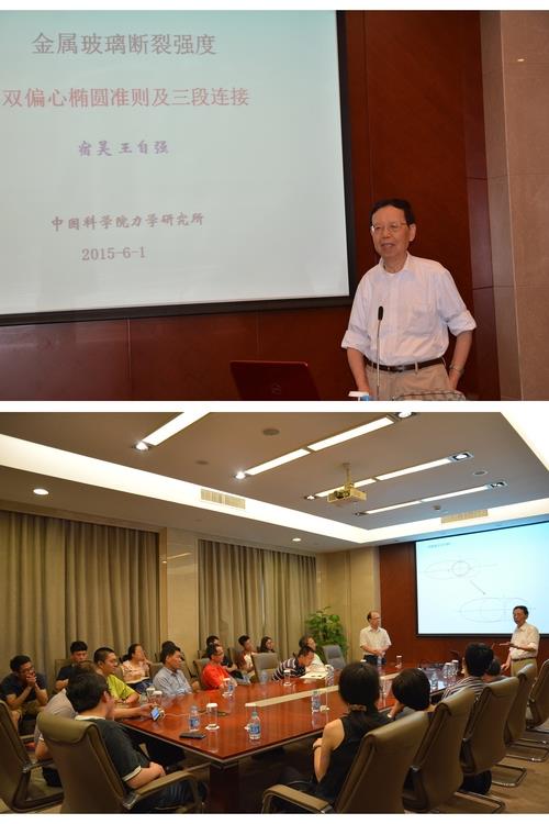 王院士的报告着重介绍了近十年来有关金属玻璃断裂强度的各种准则。他首先简要介绍了椭圆准则和偏心椭圆准则以及相关实验研究,基于实验结果阐明金属玻璃拉伸与压缩的不对称性以及实验曲线局部抖动现象。然后系统介绍了近期建立的双偏心椭圆准则和三段连接。最后介绍了纯剪切强度的测定和基于实验归纳的双偏心椭圆准则。