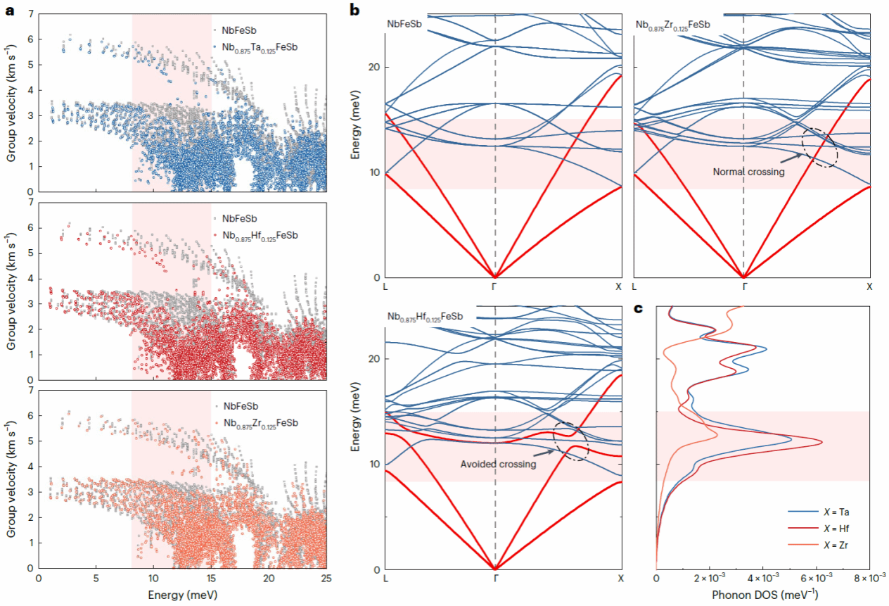 图3 重元素掺杂引起声学声子-光学声子“avoided crossing”效应以及声子群速度抑制