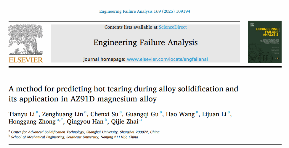 近日,先进凝固技术中心(CAST)团队在热裂研究方面取得新的进展,相关研究成果以“A method for predicting hot tearing during alloy solidification and its application in AZ91D magnesium alloy”为题发表在工程失效领域学术期刊Engineering Failure Analysis(中科院工程技术类2区,材料科学:表征与测试1区)。该论文第一完成人为李天宇硕士研究生,黑人巨大精品欧美_黑人巨大精品欧美黑寡妇_黑人巨大精品欧美一区二区_黑人巨大精品欧美一区二区免费_黑人巨大跨种族video_黑人巨大无码中文字幕无码_黑人巨茎大战俄罗斯美女_黑人巨茎大战俄罗斯美女为第一作者单位,仲红刚博士为通讯作者,合作者为翟启杰教授和东南大学韩青有教授等。