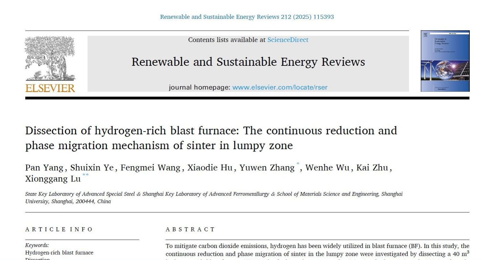 近日,氢冶金低碳技术团队对富氢高炉冷冻-解剖研究取得进展,成果发表在期刊《Renewable and Sustainable Energy Reviews》(影响因子:16.3),论文题目为“Dissection of hydrogen-rich blast furnace: The continuous reduction and phase migration mechanism of sinter in lumpy zone”。论文第一作者为博士研究生杨盼,张玉文和鲁雄刚教授为通讯作者。